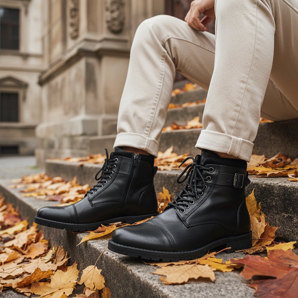 Step into rugged sophistication with the JJ Leather Lace Up Mens Boots, a statement piece built for both resilience and refined everyday wear. Crafted from rich black leather, these mens boots features a classic lace-up front, sleek cap toe detailing, and a functional ankle buckle for a subtle biker-inspired edge. The padded collar ensures comfort, while a side zip offers easy wear without compromising structure.