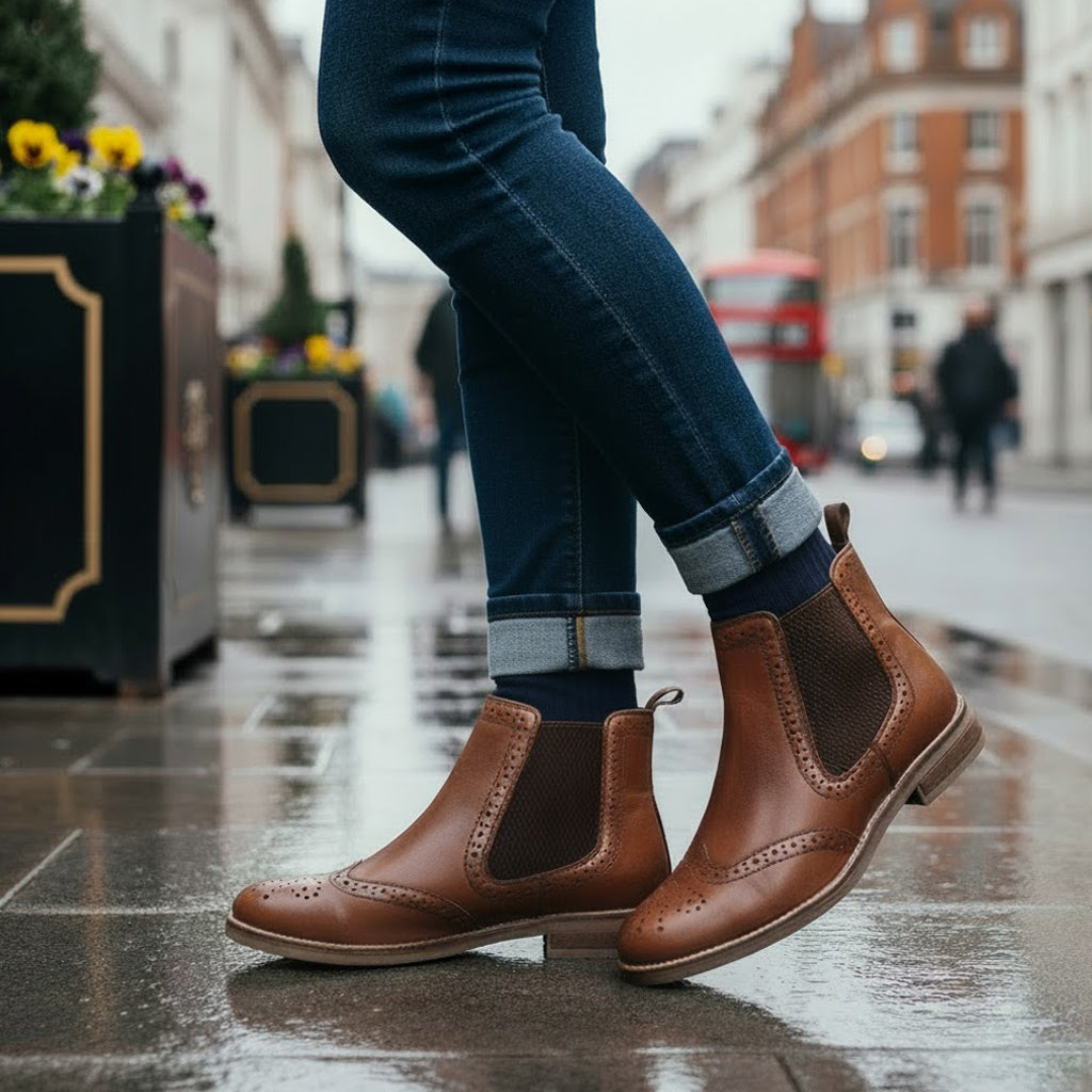 Refined with a touch of heritage charm, the Fiona Leather Brogue Boots are the perfect fusion of Chelsea boot ease and timeless brogue detailing. Crafted from smooth tan leather, these ankle boots feature intricate perforations along the toe and sides, adding a traditional twist to a contemporary silhouette. Elastic side gussets and a pull tab ensure effortless wear, while the low stacked heel makes them an all-day favourite.
