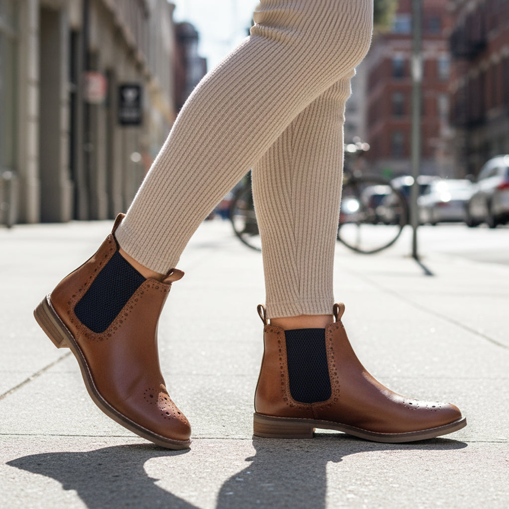 Make a statement with the Zoey Leather Womens Chelsea Boots—a timeless silhouette reimagined with contemporary edge. Crafted from smooth leather, these womens boots feature classic brogue-inspired perforations and a contrasting deep burgundy elastic panel for added visual interest and ease of wear. The sleek profile and low stacked heel add both polish and practicality to your wardrobe.